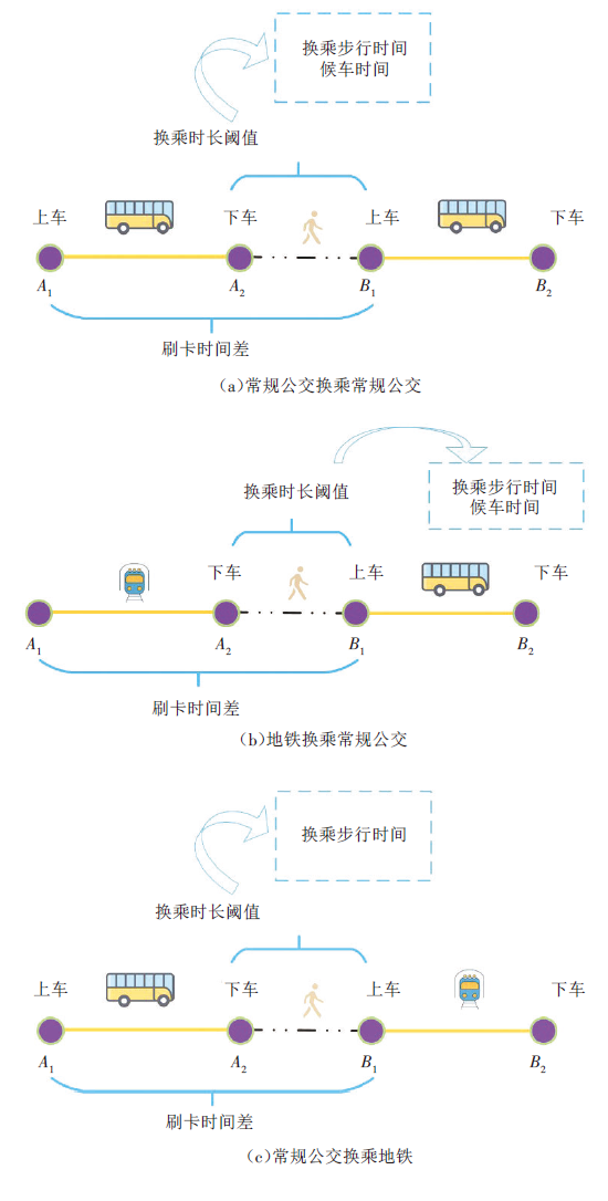 [5]使用30min作为换乘时长阈值对北京市常规公交换乘地铁的行为进行判定,并使用聚类分析法评估换乘接驳设施。Ma等人
