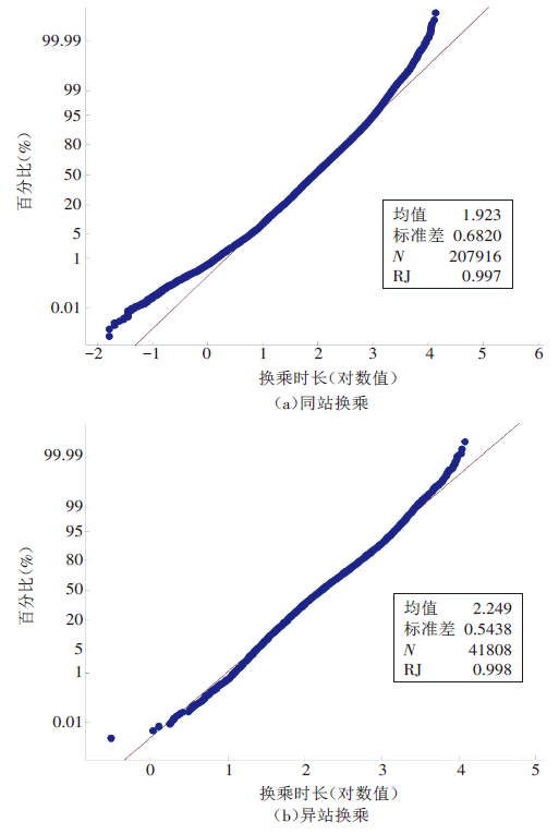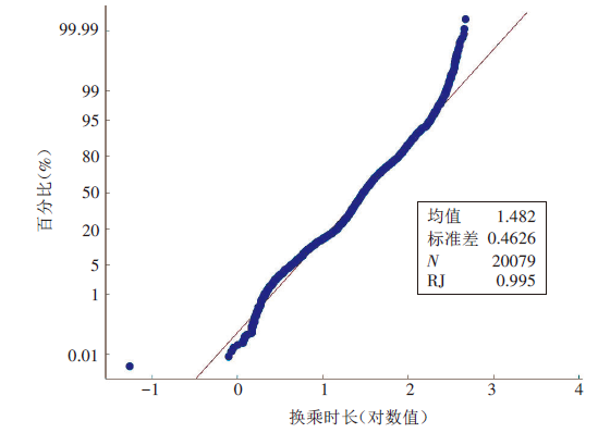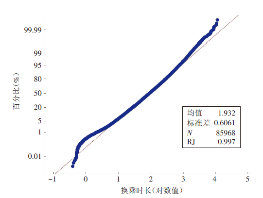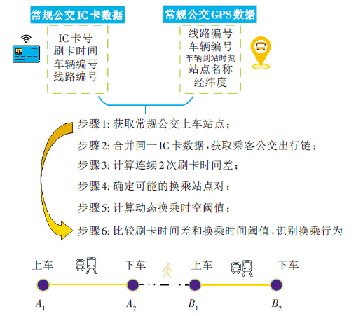 [2]。然而,这种调查方法不仅耗时长、成本高,而且收集的数据准确度不高。近年来,较多学者通过IC卡和GPS大数据研究公交乘客的换乘行为,并且通过框定换乘时长阈值判断乘客是否换乘