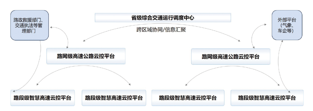 | 路网云控 平台 | 1.由区域高速公路运营集团建设和运营; 2.支持汇聚所辖路段的所有信息,可支持所辖路网区域内跨路段数据汇总、交通管控、用户服务; 3.支持接收数据中心的各类调度数据,支持获取其他区域的路况查询、交通态势研判等数据 |