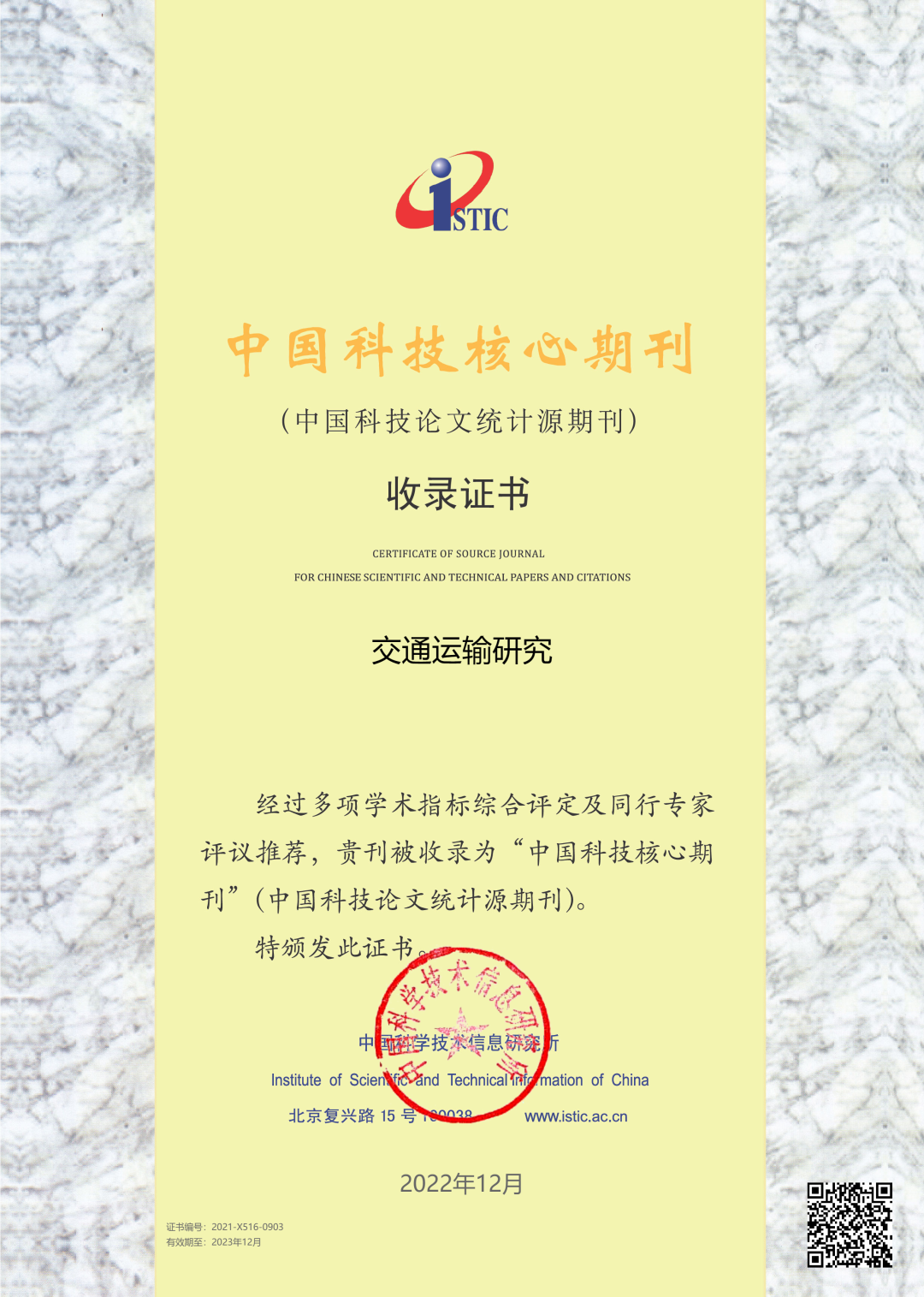 近日,中国科学技术信息研究所发布了《2022年版中国科技期刊引证报告(CJCR)》,2022年版中国科技核心期刊目录同时出炉。《交通运输研究》再次通过评审,被收录为“中国科技核心期刊(中国科技论文统计源期刊)”,核心影响因子较去年提升39.3%。